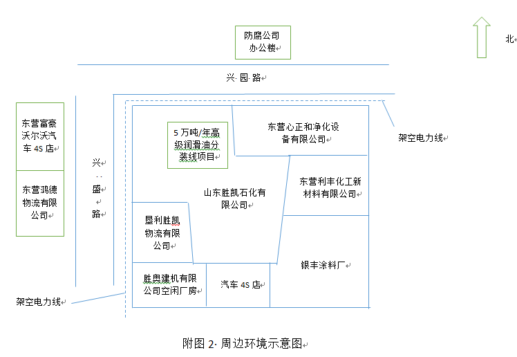 東側(cè):廠區(qū)圍墻東側(cè)自北向南依次為東營心正和凈化設(shè)備有限公司(石油裝備生產(chǎn)企業(yè))、東營利豐化工新材料有限公司與銀豐涂料廠,共用圍墻。西側(cè):廠區(qū)西側(cè)為興盛路,路對(duì)面為東營富豪沃爾沃汽車4S店與東營鴻德物流有限公司。南側(cè):廠區(qū)圍墻南側(cè)為墾利勝凱物流有限公司、勝奧建機(jī)有限公司空閑廠房、汽車4S店。北側(cè):廠區(qū)北側(cè)圍墻外為興園路,路北為一家防腐公司辦公樓。 |