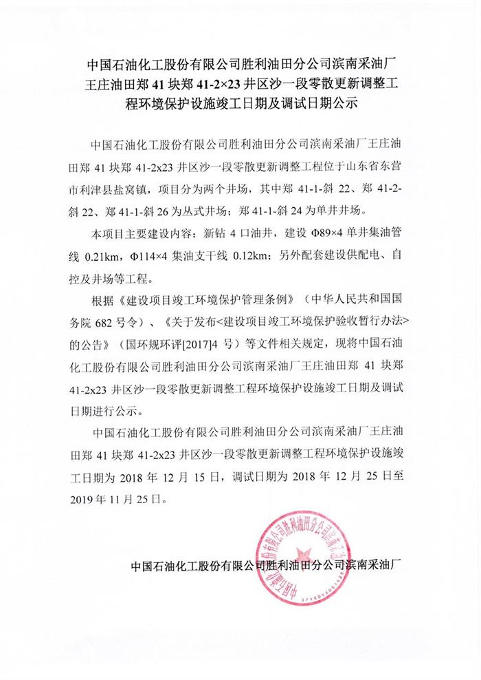 中國石油化工股份有限公司勝利油田分公司濱南采油廠王莊油田鄭41塊41-2×23井區(qū)沙一段零散更新調(diào)整工程環(huán)境保護(hù)設(shè)施竣工日期及調(diào)試日期公示