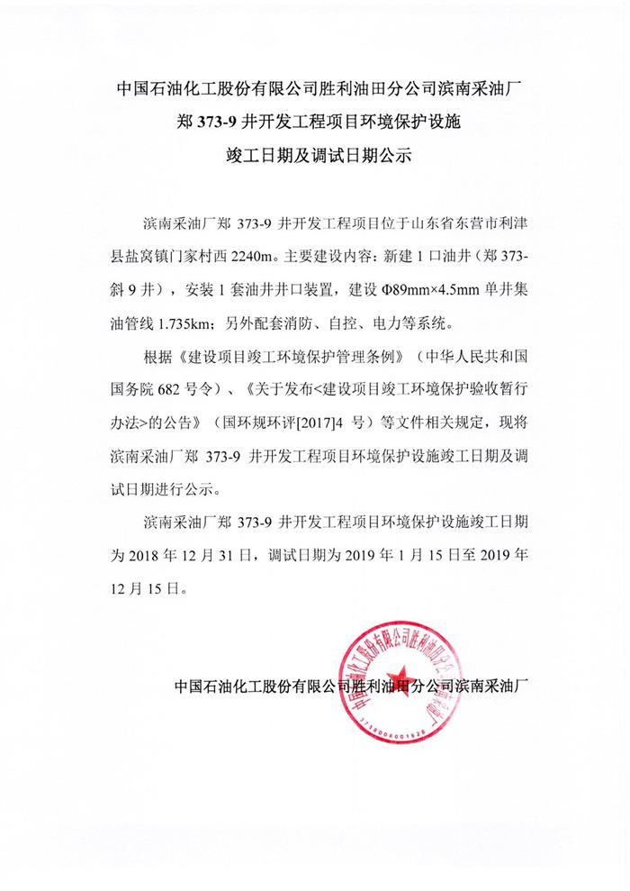 中國(guó)石油化工股份有限公司勝利油田分公司濱南采油廠鄭373-9井開(kāi)發(fā)工程項(xiàng)目環(huán)境保護(hù)設(shè)施竣工日期及調(diào)試日期公示
