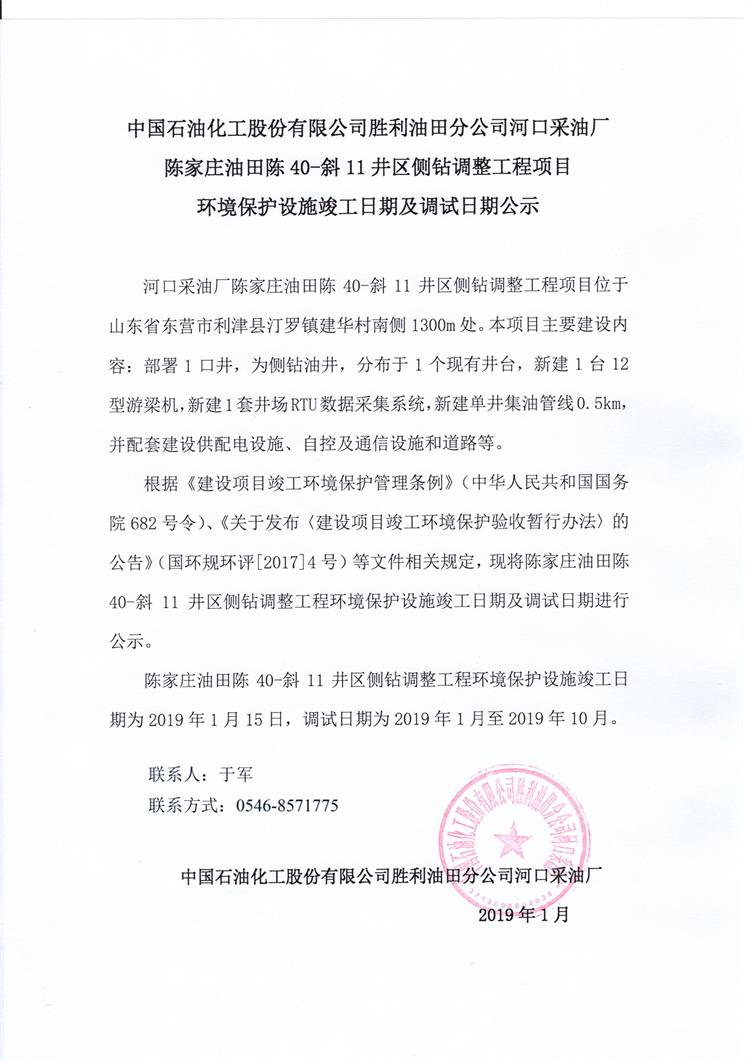 中國(guó)石油化工股份有限公司勝利油田分公司河口采油廠陳家莊油田陳40-斜11井區(qū)側(cè)鉆調(diào)整工程項(xiàng)目 環(huán)境保護(hù)設(shè)施竣工日期及調(diào)試日期公示