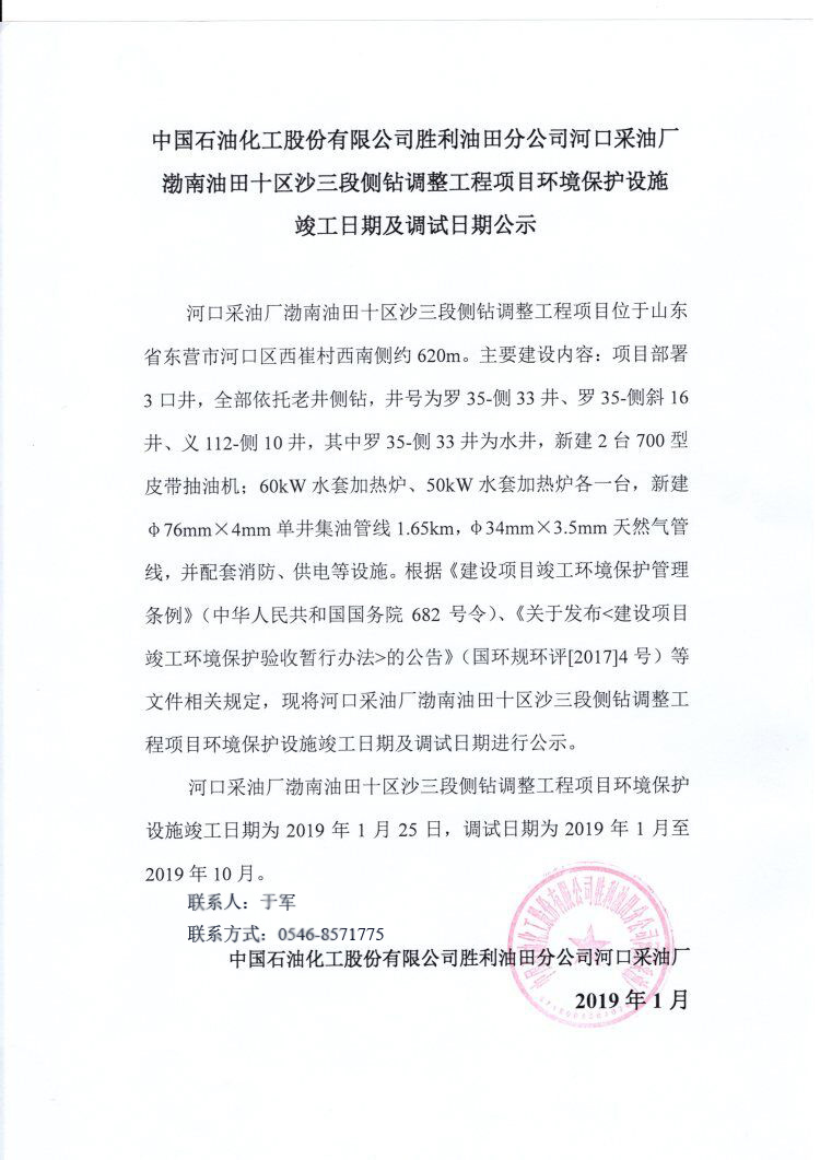 中國石油化工股份有限公司勝利油田分公司河口采油廠渤南油田十區(qū)沙三段側鉆調(diào)整工程項目環(huán)境保護設施竣工日期及調(diào)試日期公示