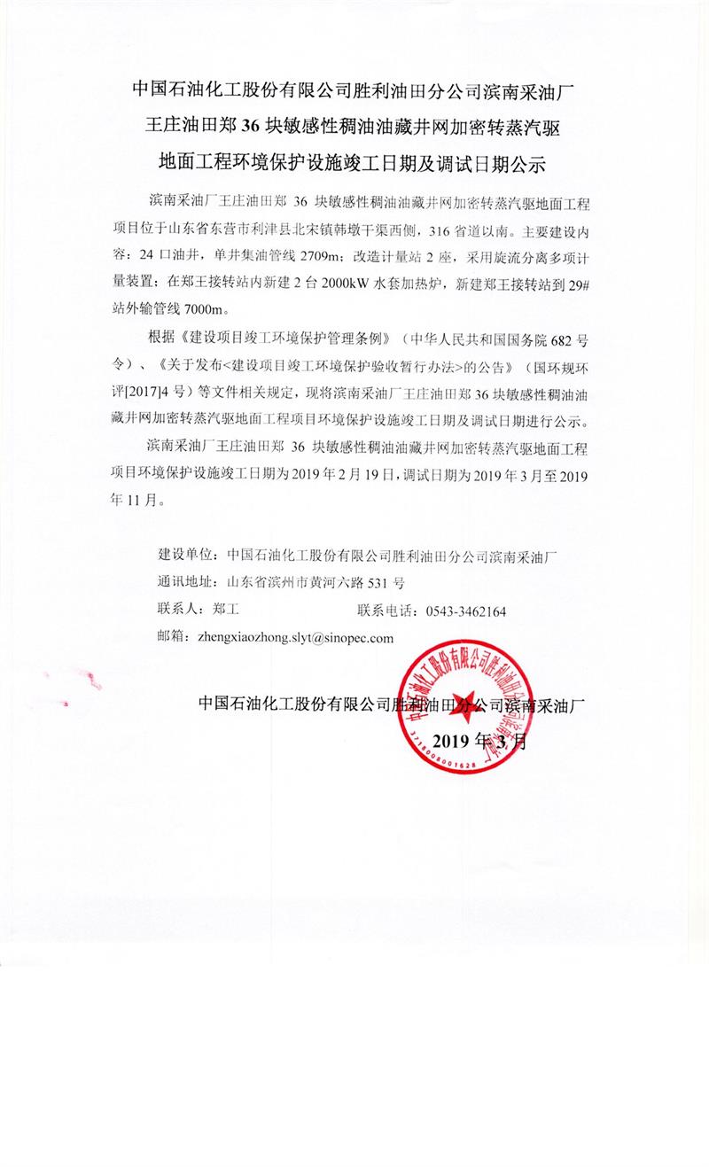 中國(guó)石油化工股份有限公司勝利油田分公司濱南采油廠王莊油田鄭36塊敏感性稠油油藏井網(wǎng)加密轉(zhuǎn)蒸汽驅(qū)地面工程環(huán)境保護(hù)設(shè)施竣工日期及調(diào)試日期公示