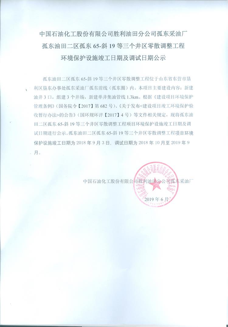 中國石油化工股份有限公司勝利油田分公司孤東采油廠孤東油田二區(qū)孤東65-斜19等三個井區(qū)零散調(diào)整工程環(huán)境保護設施竣工日期及調(diào)試日期公示